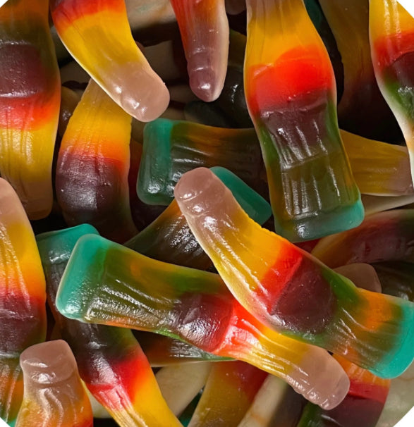 Sirop de glucose, sucre, eau, gélatine de boeuf Halal, amidon modifié de pomme de terre, acidifiants : E330, E270, arôme artificiel, agents d’enrobage : hutile végétale de Palme E901, E903, colorant E133, E100, E129. Le E129 peut avoir des effet indésirables sur l’activité et l’attention chez les enfants.