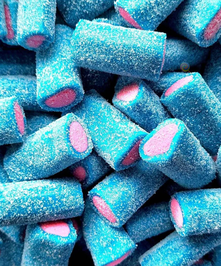 Ingrédients: sirop de glucose-fructose, sucre, farine de blé, amidon, huile et graisse végétale (palme), eau, acidifiant (e330), amidon de pomme de terre, sirop de sorbitol, gélatine de boeuf halal, arômes, antioxydant (E331iii), émulsifiant (E471), colorants (E171, E133, E129), agents d'enrobage, huile végétale (palme et noix de coco).