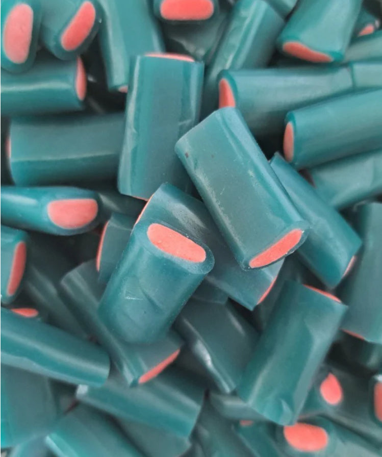 Bonbons gélifiés goût redbull en forme de mini bâtons avec enrobage bleu et garniture rose tendres.