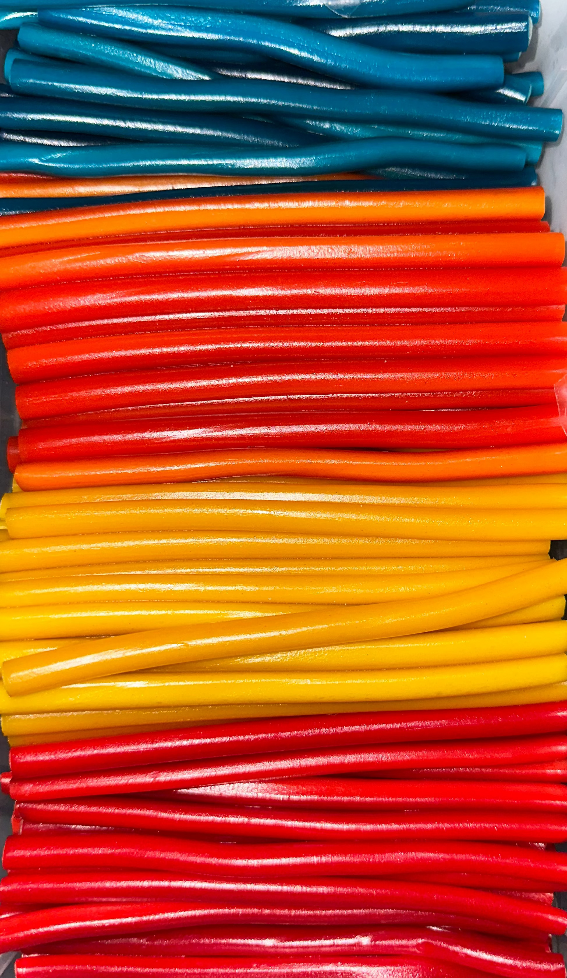 Tubes lisses d'environ 11cm, fourrés d'une délicieuse pâte aromatisée, goût : fraise, orange, mûre et citron.